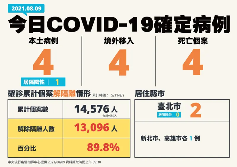 中央流行疫情指揮中心今(9)日公布國內新增4例本土病例(其中1例為居家隔離期間或期滿檢驗陽性者),均為男性,年齡介於30多歲至50多歲,發病日介於今(2021)年8月7日至8月8日。個案分布為臺北市2例、新北市及高雄市各1例;其中1例為已知感染源、3例關聯不明,將持續進行疫情調查,以釐清感染源。