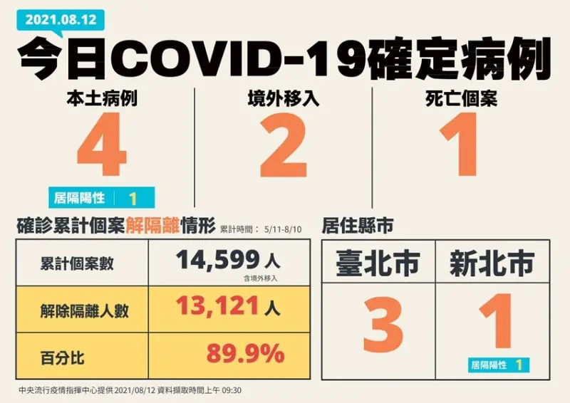 中央流行疫情指揮中心今(12)日公布國內新增6例COVID-19確定病例,分別為4例本土及2例境外移入;另確診個案中新增1例死亡。今日新增之4例本土病例(其中1例為居家隔離期間檢驗陽性者),為3例男性、1例女性,年齡介於20多歲至50多歲。個案分布為臺北市3例、新北市1例;其中2例為已知感染源、2例關聯不明,將持續進行疫情調查,以釐清感染源。![]()