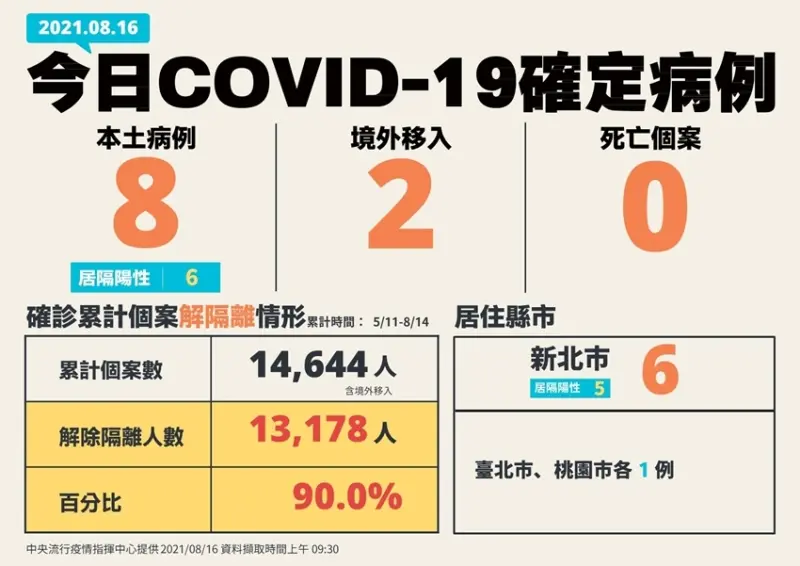 中央流行疫情指揮中心今(16)日公布國內新增8例本土病例(其中6例為居家隔離期間或期滿檢驗陽性者),為3例男性、5例女性,年齡介於10多歲至50多歲,發病日介於今(2021)年8月10日至8月15日。個案分布為新北市6例、臺北市及桃園市各1例;其中6例為已知感染源、2例關聯不明,將持續進行疫情調查,以釐清感染源。