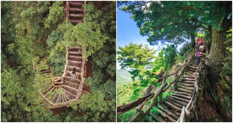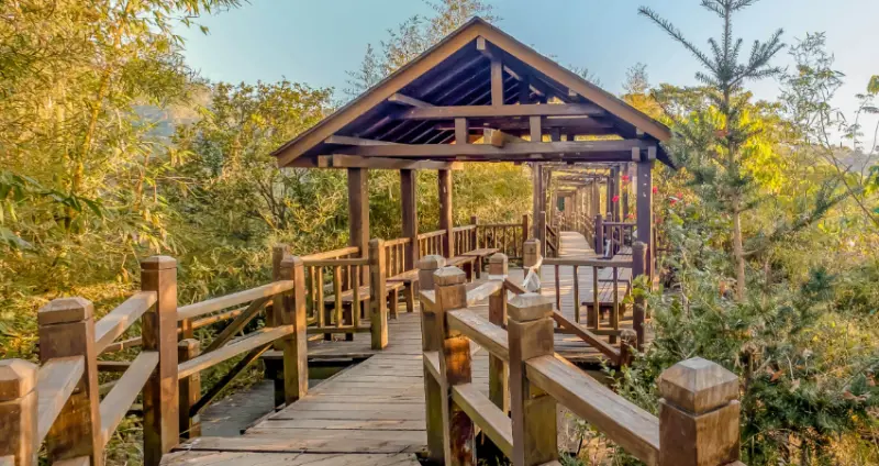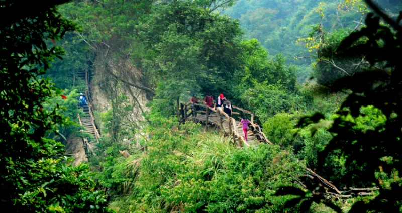東側1~4號步道的山勢地形較陡峭,屬高強度健腳級步道。以坡度落差大的2號、4號步道最具挑戰性;2號步道中有2段呈60度角的好漢坡,需拉著繩索踩著階梯上山,而4號步道有段長達300公尺的垂直陡坡,均相當考驗遊客的體力耐力。雖然健腳級步道難度高,居高臨下的景色卻相當優美。![]()