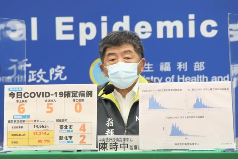 記者會現場,指揮官陳時中表示:6例本土都不是居家隔離驗出的個案,其中台北市有4例,新北有2例,而北市某大樓(台電)陸續驗出3例為同一層樓,今日早上衛生單位也將整層樓做PCR檢驗,全棟大樓完整消毒,並且分流上班,下午檢驗結果會陸續出爐。![]()