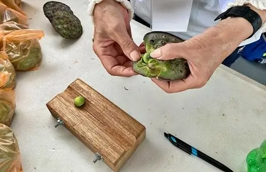 手剝蓮子體驗親自嘗試用傳統木製工具剝蓮子。在工具中間插有刀片,將蓮蓬中取出的蓮子放在工具的溝槽中,蓋上木條往前推,就能把蓮子外殼輕鬆割開,取出裡面的蓮子。