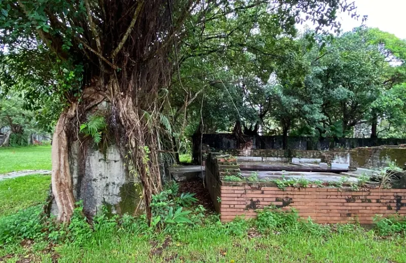 ▲被長年生長的植物盤根錯節所覆蓋的,是當時所建設的防爆牆,厚度達70公分,將無線電機組局部包圍保護。