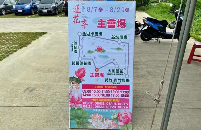 在蓮花季假日期間,設有定時定點接駁車,方便民眾到各大農園遊玩,非常方便!歡迎多加利用,充分享受觀音區之美!(主會場的乘車點在會場與停車場之間,若不確定方向可詢問工作人員)