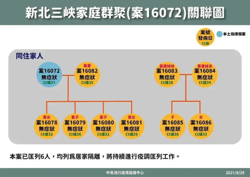 關於國人所在意的「新北三峽家庭群聚」一案,指揮官陳時中說明:其中9例為已知感染源,為新北市三峽家庭群聚(案16072),總共10人感染。陳時中說明,這10人都是同住家人,因為居住上比較壅擠,整個家庭都受到感染,目前僅一名小孩尚未感染,其餘從2歲到10歲的孩子都遭感染。另有4例關聯不明,將持續進行疫情調查。