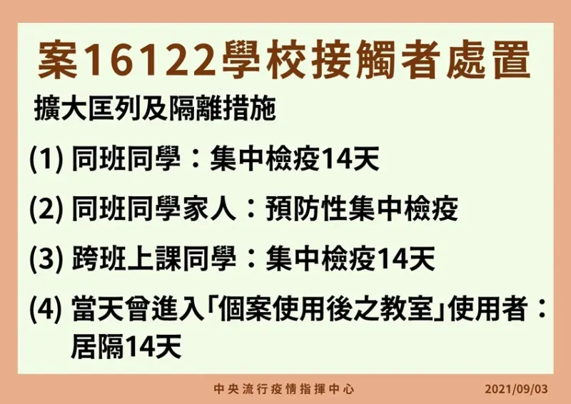 中央流行疫情指揮中心今(3)日公布國內新增2例本土病例中,案16121為本國籍50多歲女性,今(2021)年8月26日至9月1日期間因出現咳嗽、流鼻水、發燒、腹瀉、味覺異常及喉嚨痛等症狀多次就醫,9月2日再次就醫並採檢,於今日確診(Ct值25);已匡列接觸者1人,列居家隔離,其餘相關接觸者匡列中。案16122為本國籍10多歲男性,8月30日自覺有疑似中暑症狀,9月1日喉嚨痛,9月2日因家人(案16120)檢出COVID-19陽性,由衛生單位安排採檢,並於今日確診(Ct值11);相關接觸者匡列中。![]()