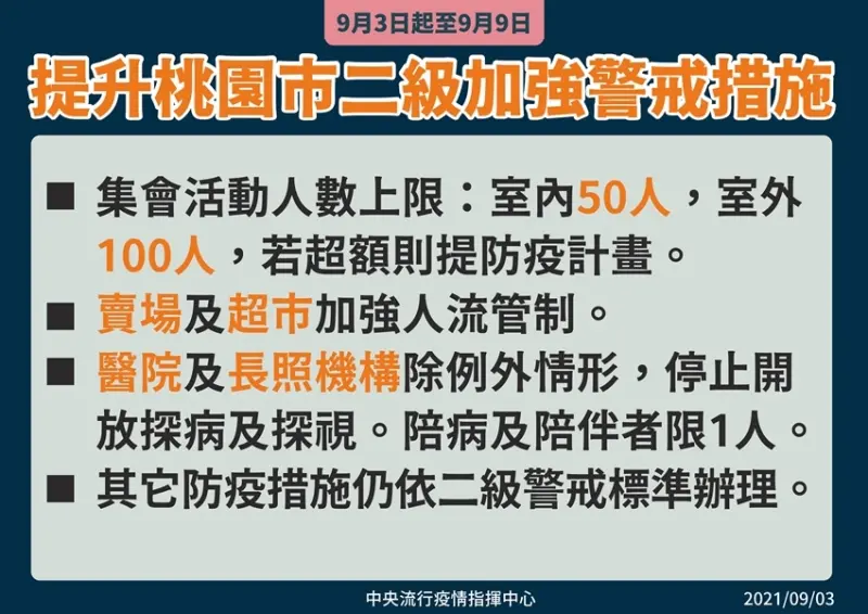 此外,因應境外移入Delta變異株疫情,宣布自即日起至9月9日,強化桃園市COVID-19第二級疫情警戒相關措施,請民眾落實遵循。強化措施如下: