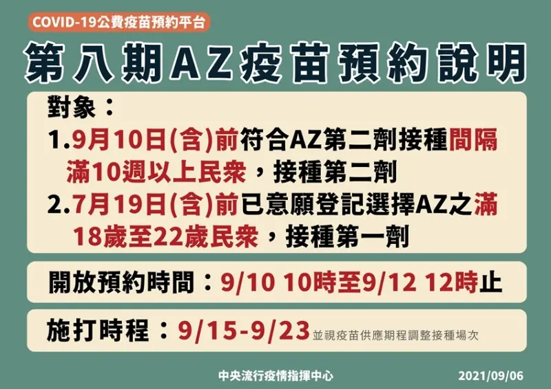 1、9月10日(含)前符合AZ第二劑接種間隔滿10週以上民眾,預約接種第二劑。