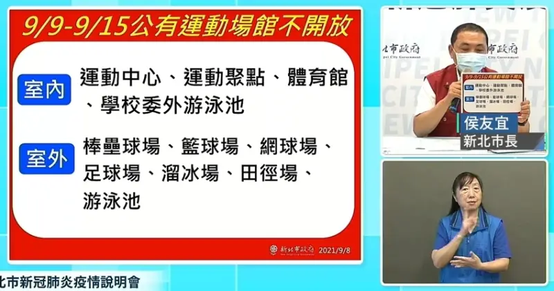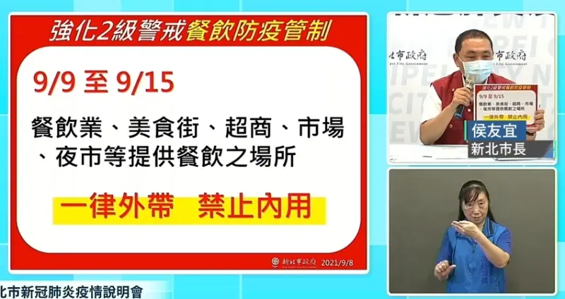 而面對Delta疫情進入校園、社區,新北市長侯友宜宣布:9/9-9/15暫停全市餐飲內用。同時,因為對經濟衝擊蠻大的,所以會視疫情發展,再做滾動式修正。新北市也強化2級警戒,體育場館、藝文場館、溫泉大眾池、旅宿業附屬設施等都暫不開放。