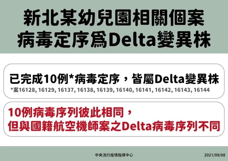 同時,指揮官陳時中表示:此群聚的基因定序結果,證實是Delta病毒,但比對國籍航空機師與幼兒園病毒序列,發現有所不同,研判是不同來源的Delta群聚。![]()