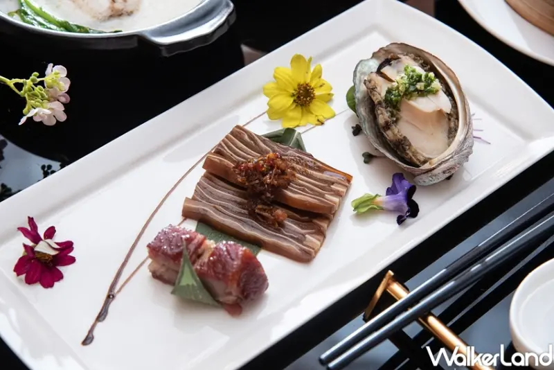其中頭盤的「桃花林御製拼盤」以「蒜香九孔鮑、XO醬千層峰、港式蜜汁叉燒」組合而成。新鮮現流鮑魚Q彈多汁、特製的「港式蜜汁叉燒」肉汁香甜。而工序繁複的「XO醬千層峰(豬耳)」搭配主廚秘製XO醬,在口中釋出干貝、金華火腿、蝦米、朝天椒等多款食材的濃縮精華,越嚼越顯絕妙滋味。![]()