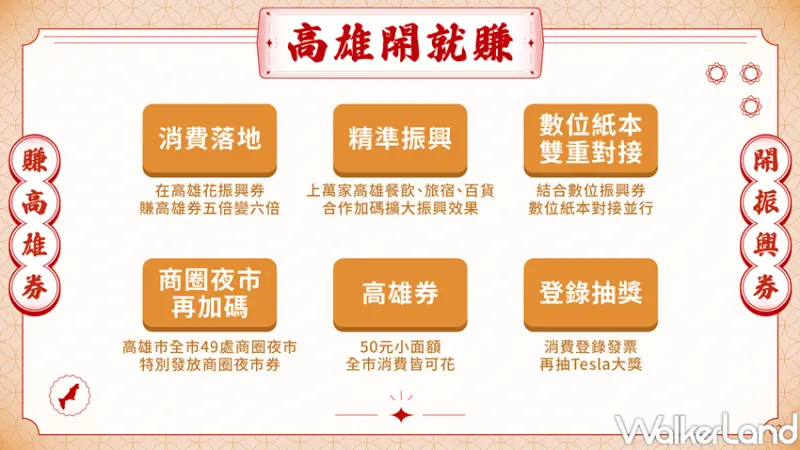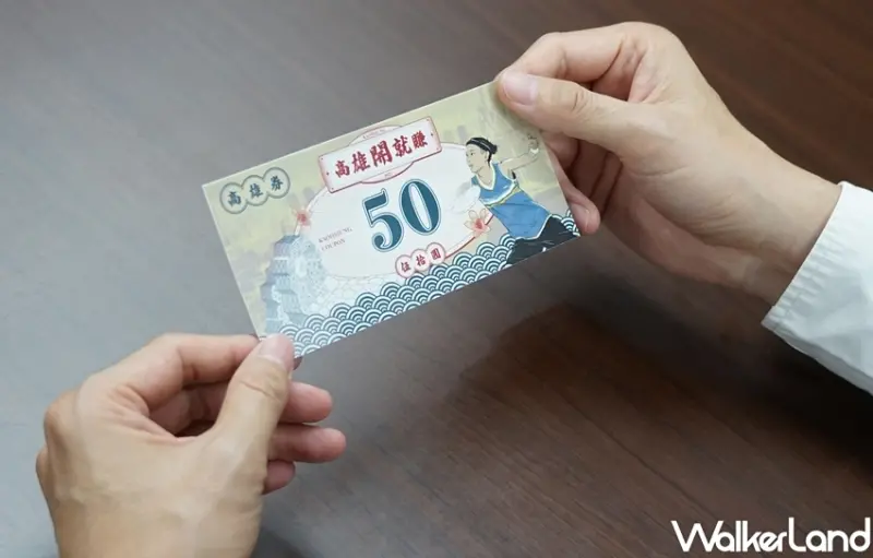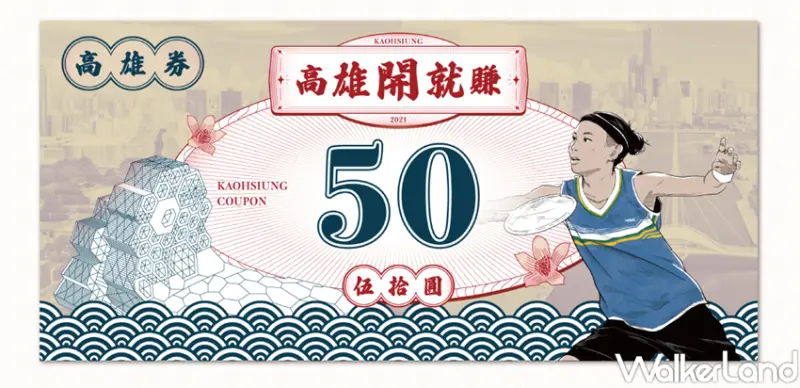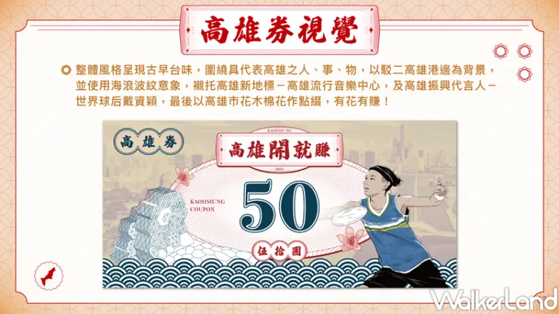 搶先公開的高雄券,版面上的設計,是由高雄振興活動代言人就是世界球后戴資穎為主角 ,並特別將小戴打球的英姿融入高雄券的設計之中,並加入高雄流行音樂中心、市花木棉花等高雄海港元素,高雄券將以50元小面額發放,全市消費皆可使用。