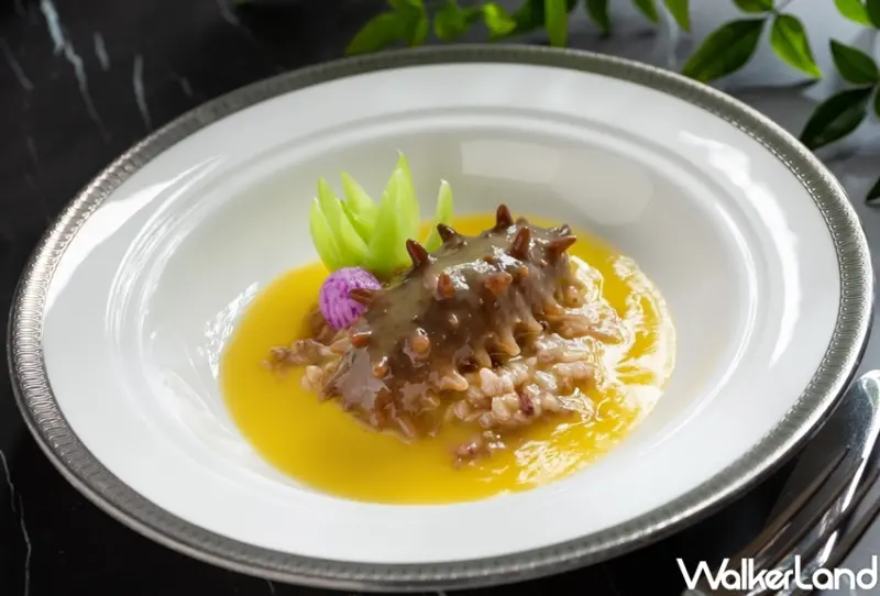 還有,工序繁複耗時的「黃燜汁五穀米扣遼參」,主廚表示,光泡發海參的時間就需三天左右。主廚嚴選日本關東遼參,用90度的熱水先浸泡一晚,再剪開遼參去除內臟、洗淨,接著於熱水中浸泡多時,最後放入冰水浸泡兩天。待遼參發好後,主廚另取鍋加入特別以雞肉、干貝等食材熬煮而成的私房黃燜汁與遼參一同煨煮,爽口Q彈的海參形色完整、入味至極,搭配五穀米粒粒分明的口感,是不容錯過的極品美味。
