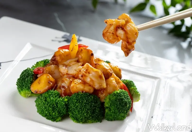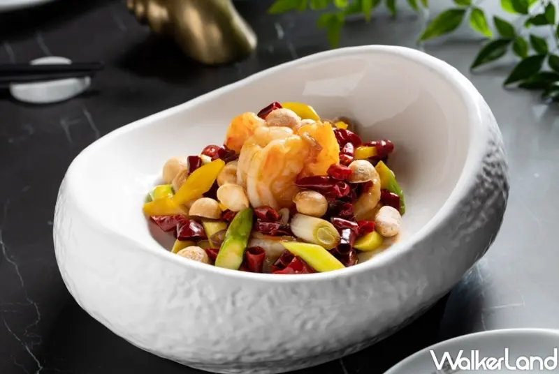 此外,「天府大蝦球」融合了粵菜蒜香以及川菜獨特椒香,主廚將蒜蓉以高溫油炸金黃香酥,再加入特選的乾辣椒、花椒等多款椒料一同過油煸出辛香,接著拌炒新鮮肥美的明蝦和清甜的蘆筍,起鍋前再撒上夏威夷果仁,香辣爽口的迷人滋味讓人一口接一口。