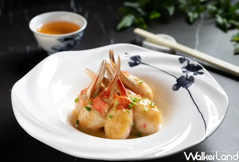 其中「奶油煎釀松葉蟹鉗」源自粵菜宴席菜「百花釀蟹鉗」,主廚將日本松葉蟹鉗以手工去除外殼,並裹上自製手打的新鮮蝦漿,拍上薄粉、入油鍋煎至金黃後,再加入老母雞燉煮而成的濃湯炆煮入味,起鍋前加入奶油增添香濃風味,盛盤搭配香氣十足的奶油醬高麗菜絲,蟹肉與蝦漿的鮮美和奶油及濃湯的馥郁滋味完美結合,是一道老少咸宜的必嘗佳餚。