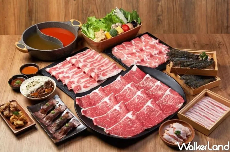 極上和牛肉、和牛黑咖哩、炙燒壽司,再加上安格斯牛、梅花豬、脆皮豬、雞腿肉、黑鑽草蝦、人氣丸料、蔬菜盒,搭配干貝昆布湯、九州蒜味湯、昆布番茄湯和牛涮風味湯底。