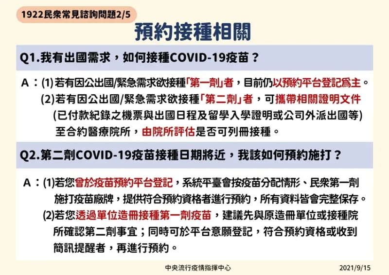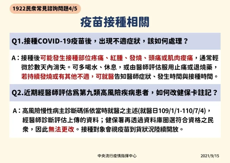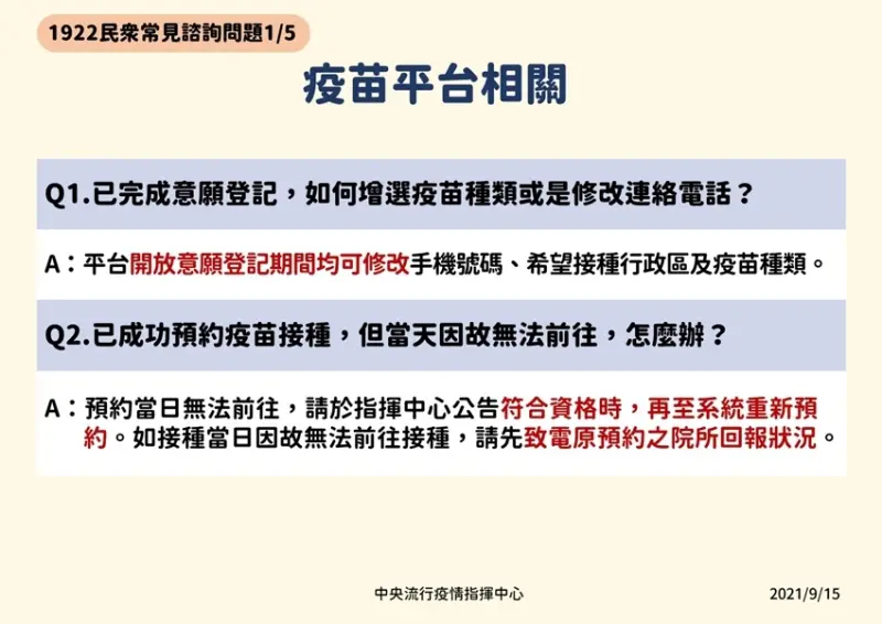 針對許多已接種第一劑莫德納的民眾,何時才有第二劑可以施打,指揮官陳時中表示:按時間排程上應是會有疫苗進來,之後9月的莫德納疫苗也是打第二劑為主。而關於民眾時常打到1922詢問疫苗相關問題,指揮中心今日也列出十大疫苗QA供民眾參考。