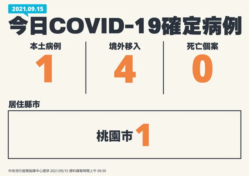 同時,今日新增4例境外移入個案,為3例男性、1例女性,年齡介於20多歲至50多歲,分別自法國(案16209)、美國(案16210、案16212)、菲律賓 (案16211)入境,入境日期介於8月31日至9月13日,均持有搭機前3日內檢驗陰性報告。![]()