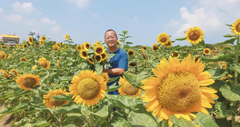 桃園觀音是與台南白河齊名的賞蓮勝地,當地的休閒農場普遍種植蓮花,唯有向陽農場以金黃燦爛的向日葵著稱,顯得獨樹一幟。園主黃永林擁有園藝專長,畢業後返鄉以老家農地創業。他認為每年蓮花季為當地招來很多遊客,但各家農場遊憩內容雷同,為了營造特色與差異性,他改種同時節盛開的向日葵,遊客賞蓮之餘還可來此飽覽向日葵花海,可謂兩全其美。![]()