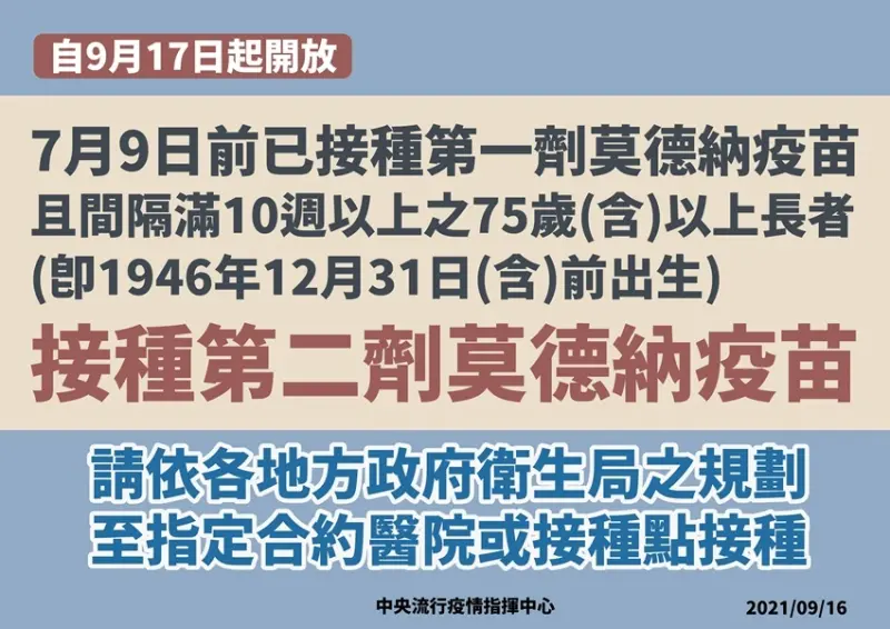 此外,考量長者族群為COVID-19感染後重症或死亡之高風險族群,為確保長者族群完成第二劑疫苗接種,預計在9月17日起開放7月9日前已接種第一劑莫德納疫苗,且間隔滿10週以上之75歲(含)以上長者,接種第二劑莫德納疫苗。