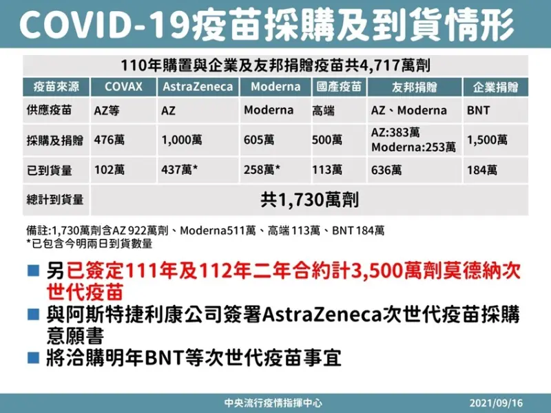 陳時中也針對目前可掌握的疫苗數量做說明,110年購置與企業及友邦捐贈4717萬劑疫苗,加上簽訂110年及112年合約購買3500莫德納次世代疫苗,總計疫苗數量8217萬劑,同時也針對AZ、BNT等次世代疫苗都有接洽中,以因應最新疫情變化與變異株,若後續有需要進行施打三、四劑疫苗的必要,也有提前準備。