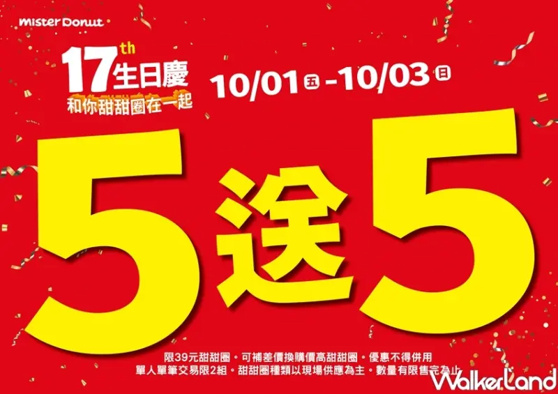 還記得2004年第一次看到Mister Donut甜甜圈的激動,這是資深甜點控才能懂的感動。不知不覺Mister Donut來台灣17年了,這17年有多少人的下午茶是伴隨著Mister Donut成長。「創造令人幸福的美味甜甜圈」為了慶祝來台17年,推出Mister Donut甜甜圈買五送五、飲品第2杯半價優惠。