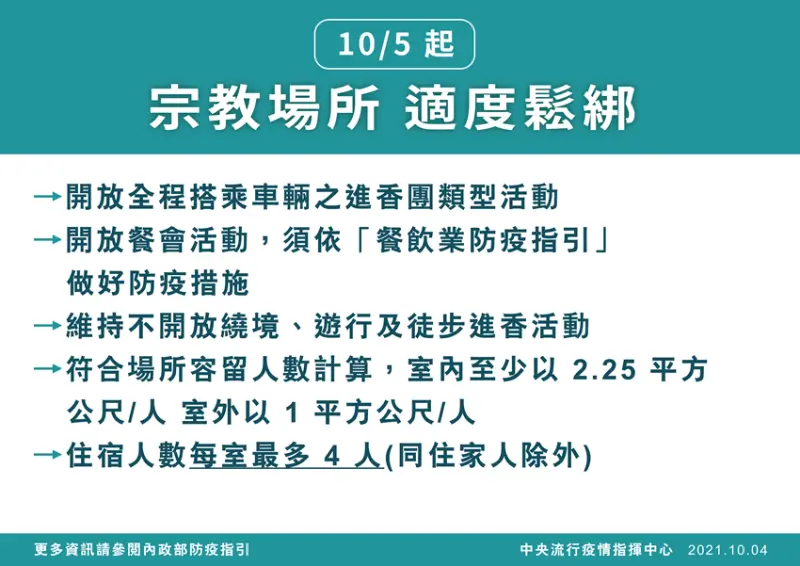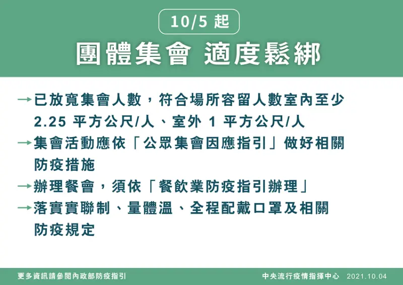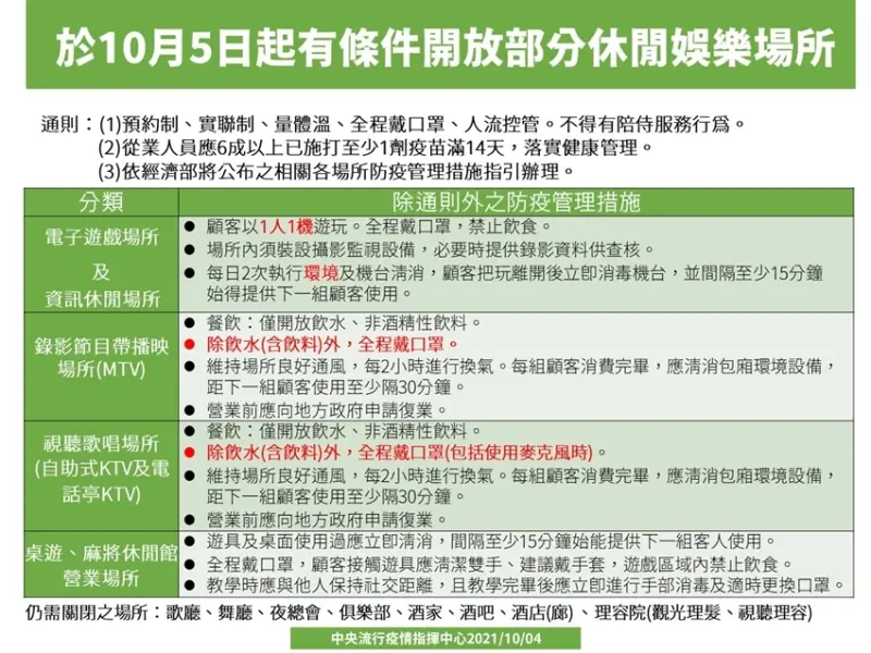 其中,針對電子遊戲場所、資訊休閒場所、錄影節目帶播映場所(MTV)、視聽歌唱場所(自助式KTV及電話亭式KTV)、桌遊、麻將休閒館營業場所,將有條件開放。此外,宗教祭祀,也有條件開放進香團、餐會活動。而餐飲內用不限隔板或1.5公尺間距。