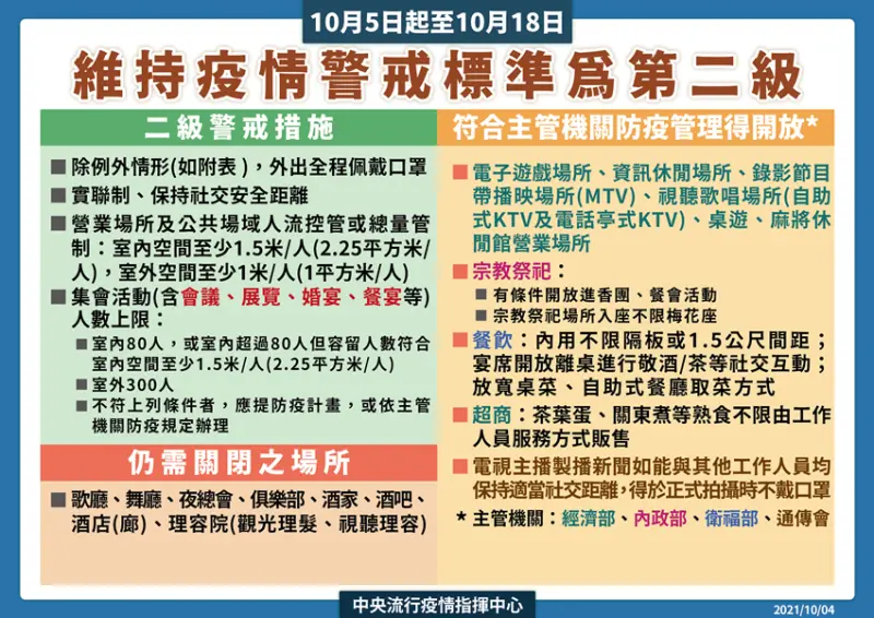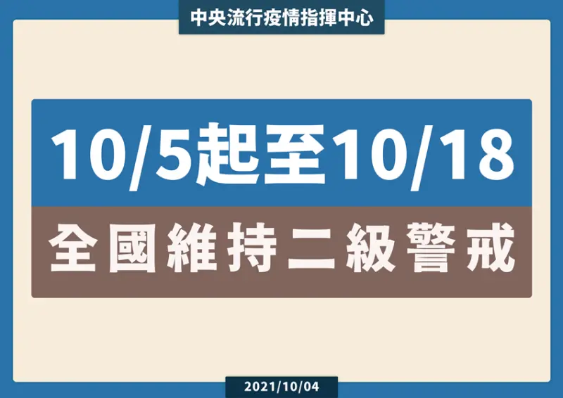 中央疫情指揮中心表示,考量國內疫情已趨緩並且穩定控制,經與相關單位溝通討論及評估後,副指揮官陳宗彥宣布,疫情二級警戒維持至10月18日,同時針對娛樂場所、宗教祭祀、餐飲、超商、新聞工作人員提出最新相關指引,請民眾落實個人防護措施,主動積極配合各項防疫措施,以兼顧防疫與生活品質。![]()