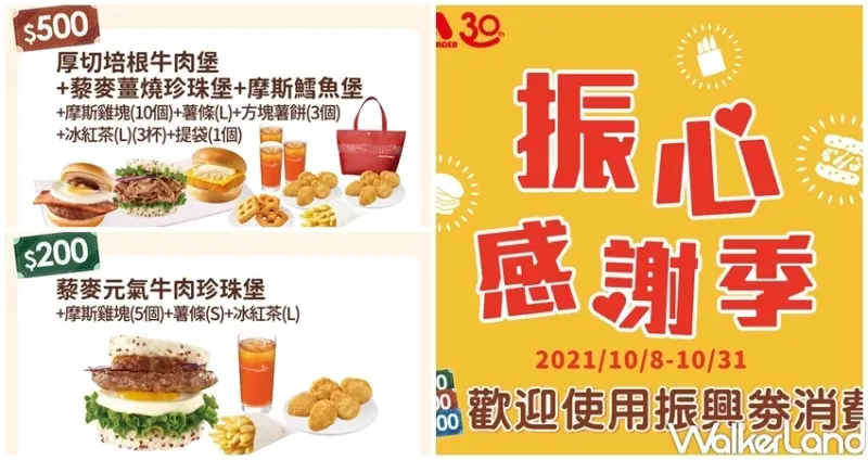 摩斯漢堡於10/8-10/31推出振心感謝季活動,包含200元及500元優惠組合,凡使用振興券或數位支付包含LINE Pay、街口支付、悠遊卡、一卡通、台新信用卡,消費滿200元加贈蒟蒻兌換券一張。