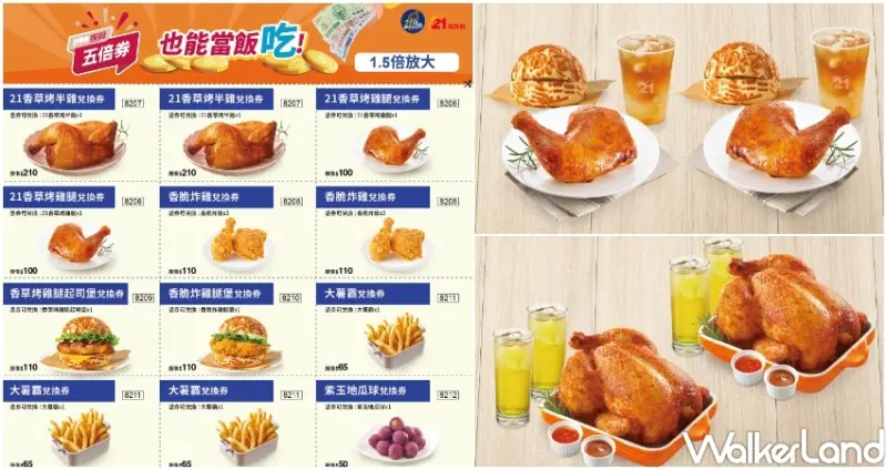 持紙本面額500元振興券還可以購買價值1000元的2份香草烤雞分享餐,餐點內容包含雙份21招牌香草烤雞(附專屬烤雞沾醬2個)及中杯四季春冰茶2杯。