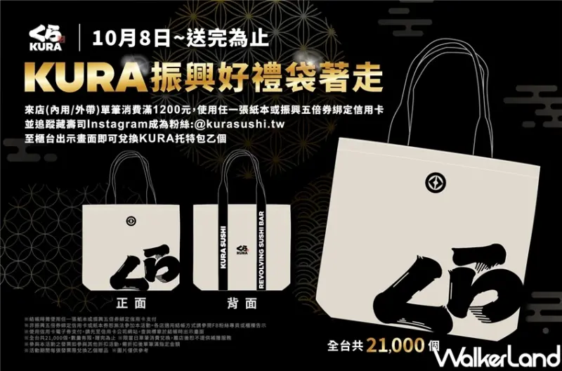 從10月8日開始於全台藏壽司不論是外帶還是內用,各店當日單筆消費滿1,200元,使用任一張紙本或振興五倍劵綁定信用卡支付,並追蹤官方Instagram,就能將時尚與實用兼具的「KURA托特包」帶回家。此外,從10月15日到10月21日一連七天在全台店鋪盛大推出初秋限定的「鮪貝嚐鮮祭」。同時,眾所矚目,三貫組合超高CP值的「鮭魚卵鮑魚奢華三貫」、「海之幸豪華三貫」也將限期登場。![]()