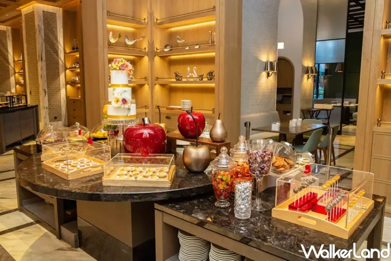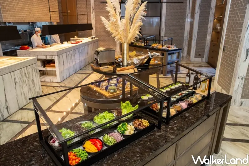 「熱享美饌區」有印度主廚特製咖哩及饢餅、數款美味熱食、精選湯品等。話題十足的「繽紛鮮蔬沙拉區」,以近二十種水耕蔬菜及根莖類,搭配十多種特調醬料及堅果,讓饕客每一口都吃得到清鮮滋味。最受女性歡迎的「夢幻甜點檯」,宛如「奢華精品櫃」的陳設格外吸睛,供應台北萬豪點心房每日特製的精品蛋糕、迷你馬卡龍、法式Bon Bon棒棒糖、現做法式可麗餅、熱烤布丁,還有時令鮮果、哈根達斯冰淇淋等,堪稱「螞蟻族」必朝聖的區域。