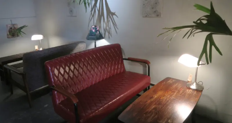 咖啡廳裡隨處可見各式生氣盎然的植栽,有種自在隨興卻又不容忽視的存在感,頭上的、腳下的, 每一株都是店家悉心照顧的成果。室內雖然滿是綠意,但鬱鬱不走明亮燦爛的風格,而是以昏黃的燈光做為主要照明,營造出一個慵懶愜意的環境。柔柔滲出的溫暖光束, 搭配各處蒐集來的老桌老椅老菜櫥,協調又符合店家個性。