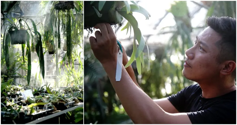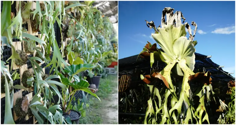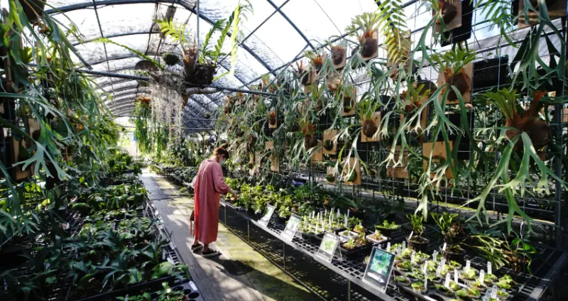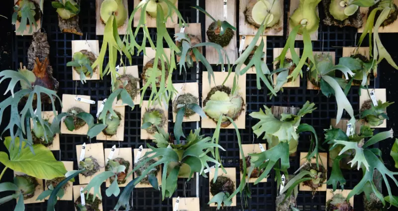 「蕨的想買就買」工作室主人Tommy對鹿角蕨喜愛程度,從原本蒐集各式各樣的鹿角蕨品種與品系,到後來鑽研教學宛如鹿角蕨職人,目前除了網路販售,亦同步成立工作室提供零售與開放參觀。工作室座落台南市安南區,遠離市中心的園地環境非常開闊,有別於小型賣店玲瓏雅致,走進工作室猶如進入一座秘密基地的植物園,在黑色網布採光罩覆蓋之下,漫天而下的蕨類植物壯觀又震撼,整座溫室充滿了光合作用之下的葉綠素, 讓人感覺特別自然清新。