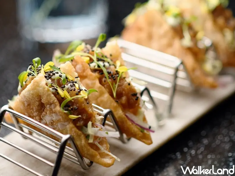 而外觀炫麗的「生鮪魚墨西哥玉米餅」則是結合墨西哥與日本元素而成的塔可(Taco),以餛飩皮炸成的餅皮,放入綠檸檬油醋涼拌的高麗菜絲、紅洋蔥絲等,再鋪上薑味醬油拌過的生鮪魚餡,最後淋上日本芥末美乃滋,鮮、脆、酸的清爽口味,是Jimmy非常推薦的搭配調酒的必點料理。