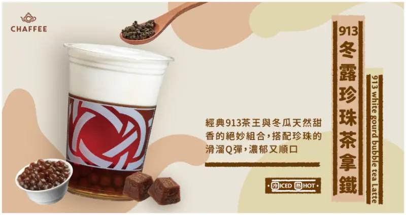 CHAFFEE 的招牌913珍珠茶拿鐵,熟悉的茶滋味與冬瓜結合,交錯出合拍好味道,就是在這個冬天不能錯過的「913冬露珍珠茶拿鐵」。不同於傳統冬瓜的死甜,嚴選優質提煉的冬瓜磚,經過熬煮加入913茶王拿鐵,特殊的冬瓜天然糖香與913回甘茶滋味,巧妙混搭出迷人的風味,還沒喝得要快,季節限定過了就沒了!![]()