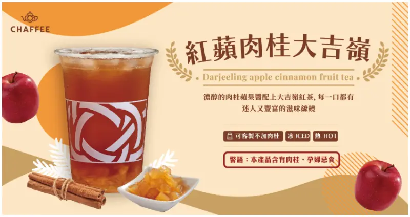 肉桂,近年來已晉升為甜點界的新寵之一,經過飄著肉桂香的店,濃郁的香氣總是讓人想停下腳步多看幾眼、買杯飲料再走。為照顧肉桂控們,CHAFFEE推出季節茶飲「紅蘋肉桂大吉嶺」,大玩創意又滿足味蕾!選用大吉嶺紅茶,加入純手工製作的蘋果肉桂醬,豐富的果肉口感,滋味香醇不膩,肉桂香氣交織著紅茶香,相約好友趕快來嚐鮮!![]()