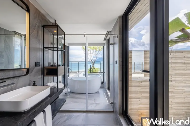 「煙波花蓮太魯閣-沁海館」坐落於面太平洋山海絕景第一排,其中壓軸登場的「沁海陽台套房」在景緻上更是收攝所有角度的山海奢華,全景玻璃窗讓室內充盈著和煦自然光,還能倚著玻璃窗觀覽隨時間流動變化的湛藍海景,戶外設有自然暖光灑落的露天風呂、270度全景無死角的私人觀景陽台,於此就能俯瞰海平面的漸層變化,入夜後吹著徐徐海風,抬頭就能被鑲嵌上星星的夜空療癒,遺世美景令人心醉。