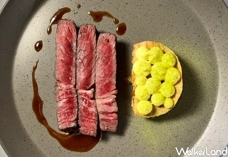 此外,「M67 澳洲和牛肋眼/薑黃馬鈴薯/黃甜椒」則是選用油脂比例適中的M67 澳洲和牛肋眼,煎烤至3分熟、搭配一旁配菜以三種層次的口感堆疊,將馬鈴薯做成的薄脆片,底層為炭烤發酵高麗菜、第二層是拌炒濃縮風味的黃甜椒、第三層為薑黃馬鈴薯泥與蒜苗粉,與牛肉一同搭配食用,以視覺、色調和風味詮釋秋季意象。