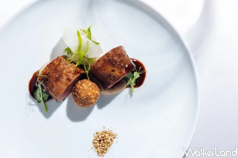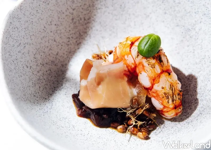 料理方面,以義式傳統菜蜜瓜火腿的水果與冷肉的組合概念的「東北角胭脂蝦/帕瑪火腿/楊桃/慢慢弄絲綢乳酪」,主廚將蜜瓜改為當季的楊桃、並加入了碳烤過的東北角胭脂蝦、再以絲綢乳酪作為食材風味間的橋樑,將海陸的鮮味與水果的酸甜串聯融合一起,並與底部搭配小麥脆粒、營造秋季意象與增添口感和香氣。