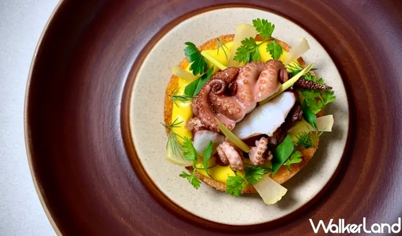 而「澎湖石鮔/玉米餅/檸檬/佛手柑」則是將澎湖的海鮮特產小章魚碳烤過後、以檸檬醋汁和墨西哥青辣椒調味、搭配炸過的玉米餅與佛手柑、最後點綴巴西里、茵陳蒿、蒔蘿、香葉芹等香草提香,營造南國海港熱情活潑的風貌、同時也表現著主廚將在地食材融入旅居美國時對南美料理風味搭配喜好與獨特見解。