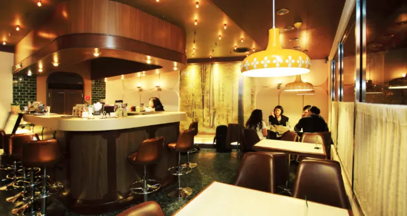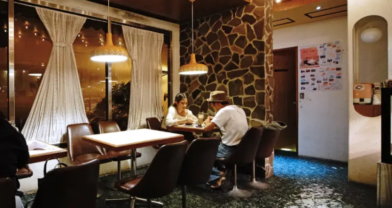 推門入內,老房子的時間韻味在空間氛圍鋪陳下,濃濃的懷舊感鋪面而來,U型吧台首先映入眼簾,擺上特別訂製的皮製旋轉高腳椅,還有吧台牆上的日本日曆、投幣式的電話機,看上去就像是電影美術設計場景般,令人無比著迷。茶色半透明玻璃的落地窗搭配蕾絲窗簾,一張張復刻手工訂製的木桌,以及仿美容凳復古設計的咖啡色皮套椅,在普普風格的橘黃色吊燈烘托下,也是氛圍感爆棚。