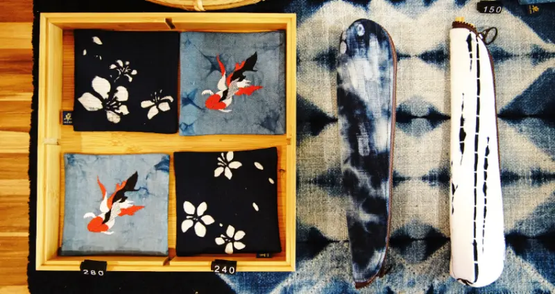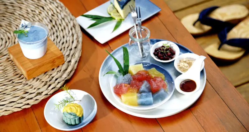 座敷上有藍染桌布椅套陳列展示,一旁放置著藍染的屏風,拉門上一件藍染的和服特別吸睛,藍染的木屐、暖簾為空間注入手感又溫暖的生活感。館內除了卓也藍染的商品展售,並設計天然染色入菜, 結合台南當地風味的美味茶點,像是白河蓮藕粉加上菜菜根、梔子、青黛製作而成的彩色藕粉蕨餅,或取材東山仙湖農場的荔枝乳酪鬆餅、龍眼花鮮奶茶。若有興趣想要親手體驗藍染技術的工藝與奧妙變化,亦可以事先預約天然染色DIY 手作,方巾、束口袋、圍巾、背包、抱枕、門簾一起來動動手。