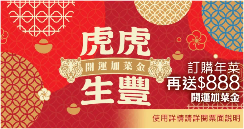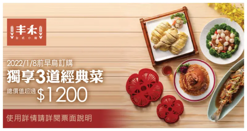 除了上述的同場加映外,凡是在2022年1月8日之前訂購的早鳥吃貨們,王品還送你價值1,276元的「中餐品牌金福飯票」,憑券可換莆田、享鴨、丰禾餐廳經典菜3道,還有888元開運加菜金,憑券到店用餐另享優惠,讓你不僅能品嚐到經典台式傳承的美味佳餚外,王品讓你虎虎生豐過好年。![]()
