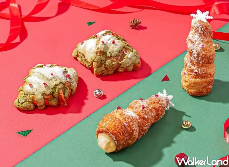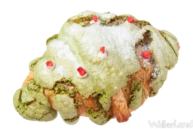 其中,「聖誕綠馬卡龍可頌」是將經典蜂巢可頌再裹上一層由日本進口抹茶粉製成的馬卡龍糖衣並撒上草莓果乾碎粒,以聖誕節最經典的紅綠配呈現,一口咬下嚐到馬卡龍般的糖心口感緊接又咬到充滿奶油香氣的蜂巢可頌、甜而不膩又富有層次的口感令人驚豔。