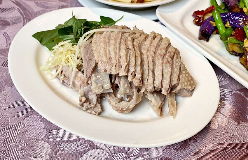 從大門口進門後即可看見廚師忙碌地分切鵝肉。名為「鵝莊」,鵝肉自然是這裡的招牌菜之一,大楊梅鵝莊的鵝肉選用養殖90日以上的成鵝,並且使用每日現宰溫體肉,以特殊方式水煮製成,嚐起來軟嫩可口、鹹淡適中,搭配一點薑絲或者九層塔更是開胃。