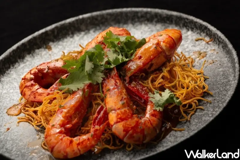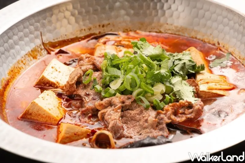 還有以檸檬汁、柳橙汁與生辣椒調製出近似泰式酸辣醬汁的「酸辣大蝦佐煎廣炒麵」,酸香微辣的醬汁均勻裹覆肥大草蝦,香煎後的廣炒麵在初上桌時香脆,經過醬汁吸附逐漸變得柔軟筋道,一次品嚐兩種不同口感。還有「豆腐水煮牛」發想自四川水煮牛,先減低辣油與辣度至更為平易近人,再採用主廚自製豆瓣醬與川椒、八角等秘製香料為底,將軟嫩的雪花肥牛片燙至7分熟,再燒熱花椒油後澆淋至鍋內細蔥上,香辣氣味瞬間充斥鼻腔!最後壓軸,是在食至最終,已吸飽醬汁的板豆腐,鹹、香、辣的滋味無窮。