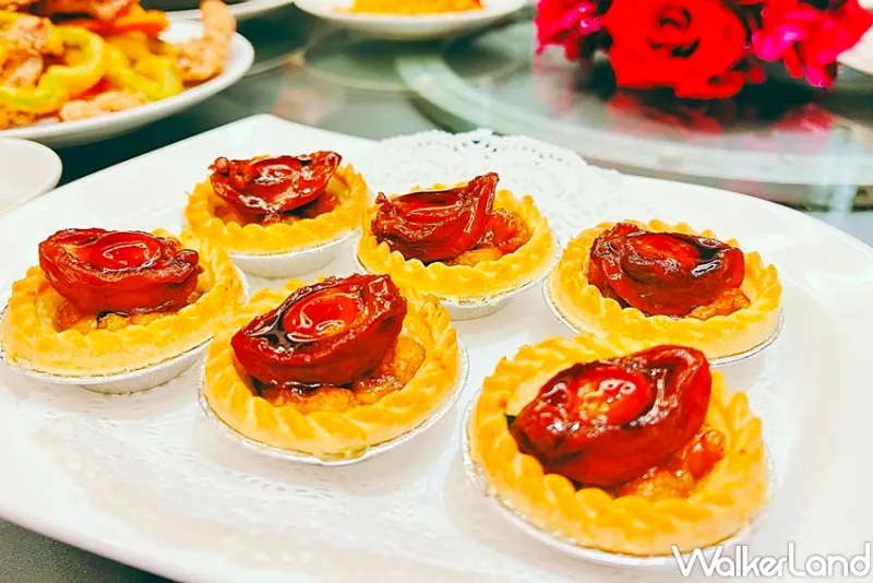 而在,廣東菜系中不可缺少的港點也加以精品化,蠔皇鮑魚酥,將塔皮中塞入炒香的雞丁、鮮蝦內餡,烤至酥脆,畫龍點睛的疊上經過老母雞、火腿、豬皮及密製醬汁滷製24小時的20頭鮑,鹹香軟嫩鮑魚與酥脆塔皮交織出極佳口感。