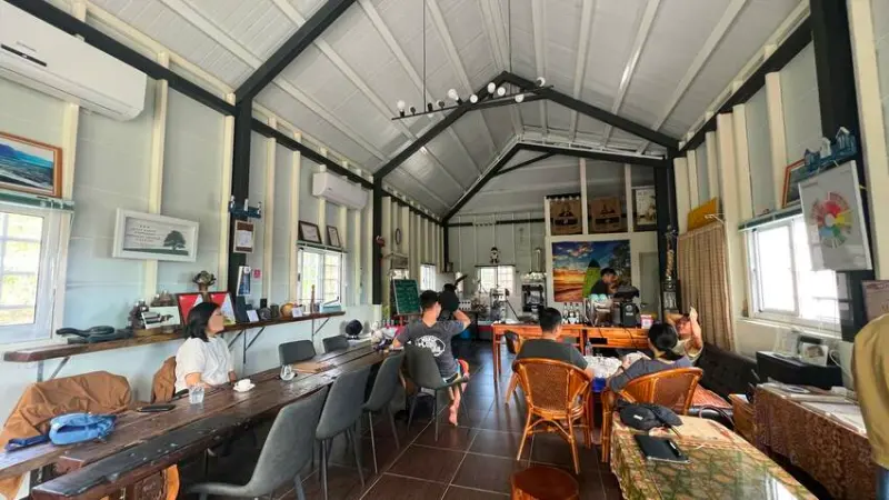 結束了觀賞社區媽媽的月桃編織燈飾生產線,被一個聲音呼喊了。「咦!你不是早上一起在海邊看我們衝浪的嗎?我山上等下要咖啡試杯,你要不要一起?」於是,來到半山腰隱密的達卡兒陶甕烘焙咖啡館,一進門才發現,整間本是原先不認識或不熟悉的朋友,一期一會今日相聚於此,除了喝喝咖啡館老闆的試杯,大夥也彼此點了自己想喝的咖啡,並且試著自己手沖咖啡(本來應該是老闆沖給我們喝,但大家太想試試自己沖一壺,然後跟每一位分享自己的選豆和手沖技術,大家還要說心得喔),只能說達卡兒本身烘豆品質很好,喝到的每一位朋友沖的每一杯咖啡都層次鮮明,風味極佳,讓本來有點孤僻的咖啡時光變得有趣又歡樂。