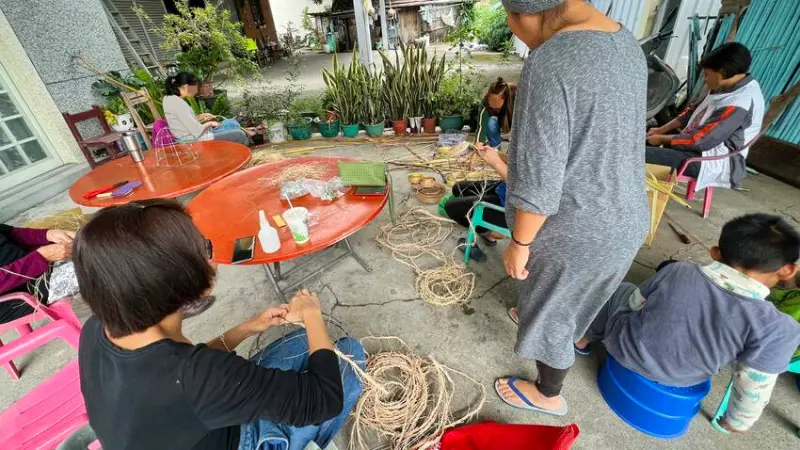 晃啊晃,聽到街坊傳來談天聲,「月桃葉不夠了,明天再去山上撿吧!」,部落裡的社區媽媽圍成一圈聊著,手裡卻完全沒有停下,將月桃葉一條又一條剝絲處理作業,再透過傳統工法巧手又捲又編,「這不是前幾天在台東鐵花村看到販售的編織燈飾?素雅月桃色澤確實做為室內百搭的擺飾,柔和曲線一條又一條折彎過後,便是一個實用又迷人的小物。」